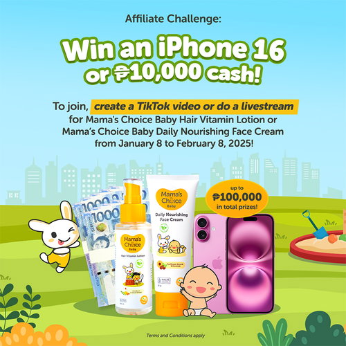 This challenge is open to all TikTok Affiliates residing in the Philippines. To participate, post your product review video of the Mama’s Choice Baby Hair Vitamin Lotion or Mama’s Choice Baby Daily Nourishing Face Cream from January 8 to February 8, 2025.