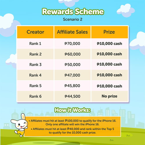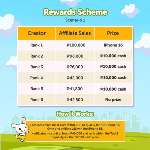 - The TikTok affiliate with the highest sales (minimum Php 100,000) during the campaign period will win a brand-new Apple iPhone 16 128GB.