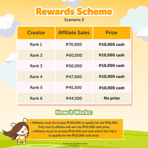 - The Rank 2 – 5 TikTok affiliates with sales of at least Php 40,000 during the campaign period will each receive Php 10,000 in cash.
